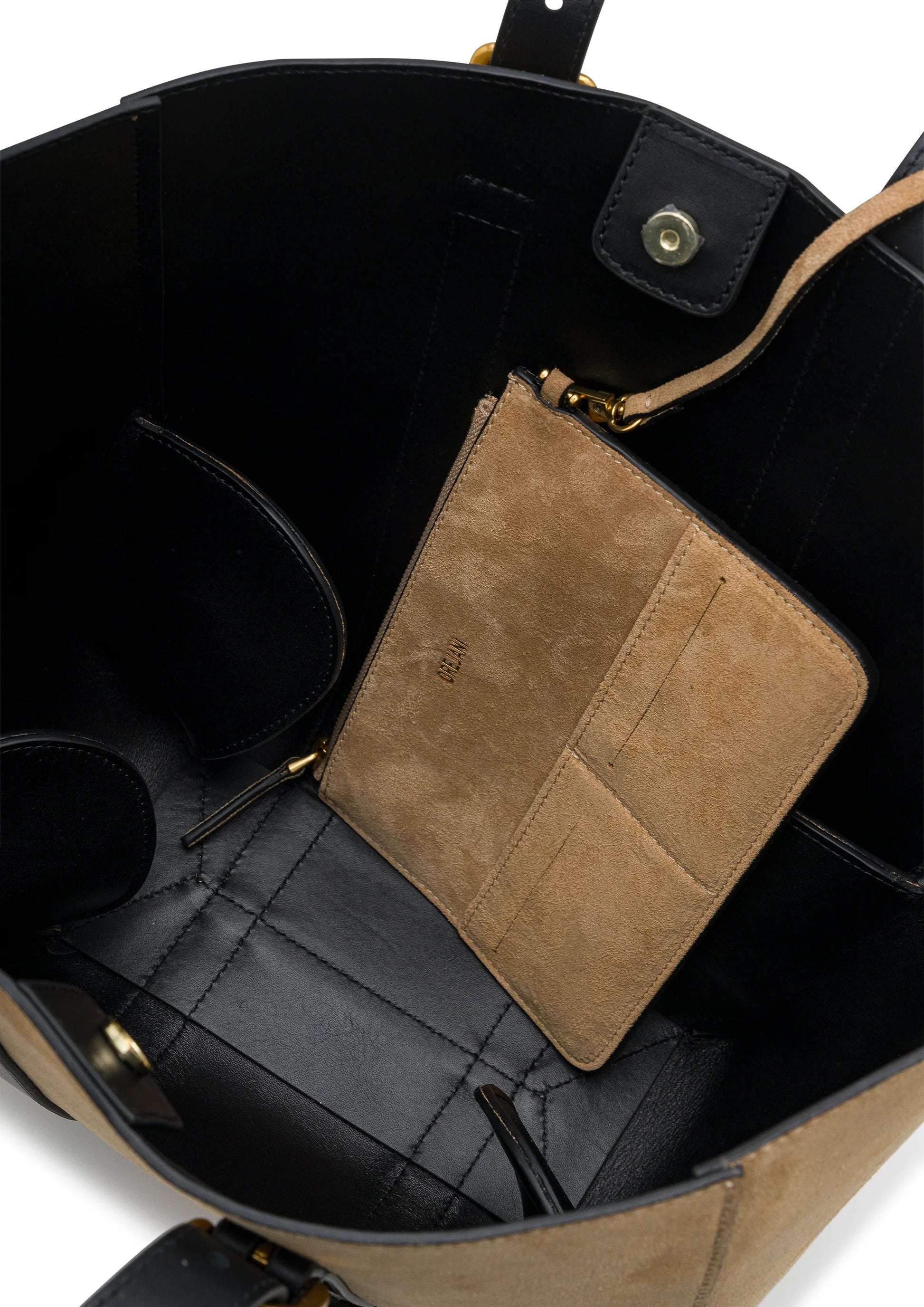 • Interior: Spacious open compartment with detachable suede pouch