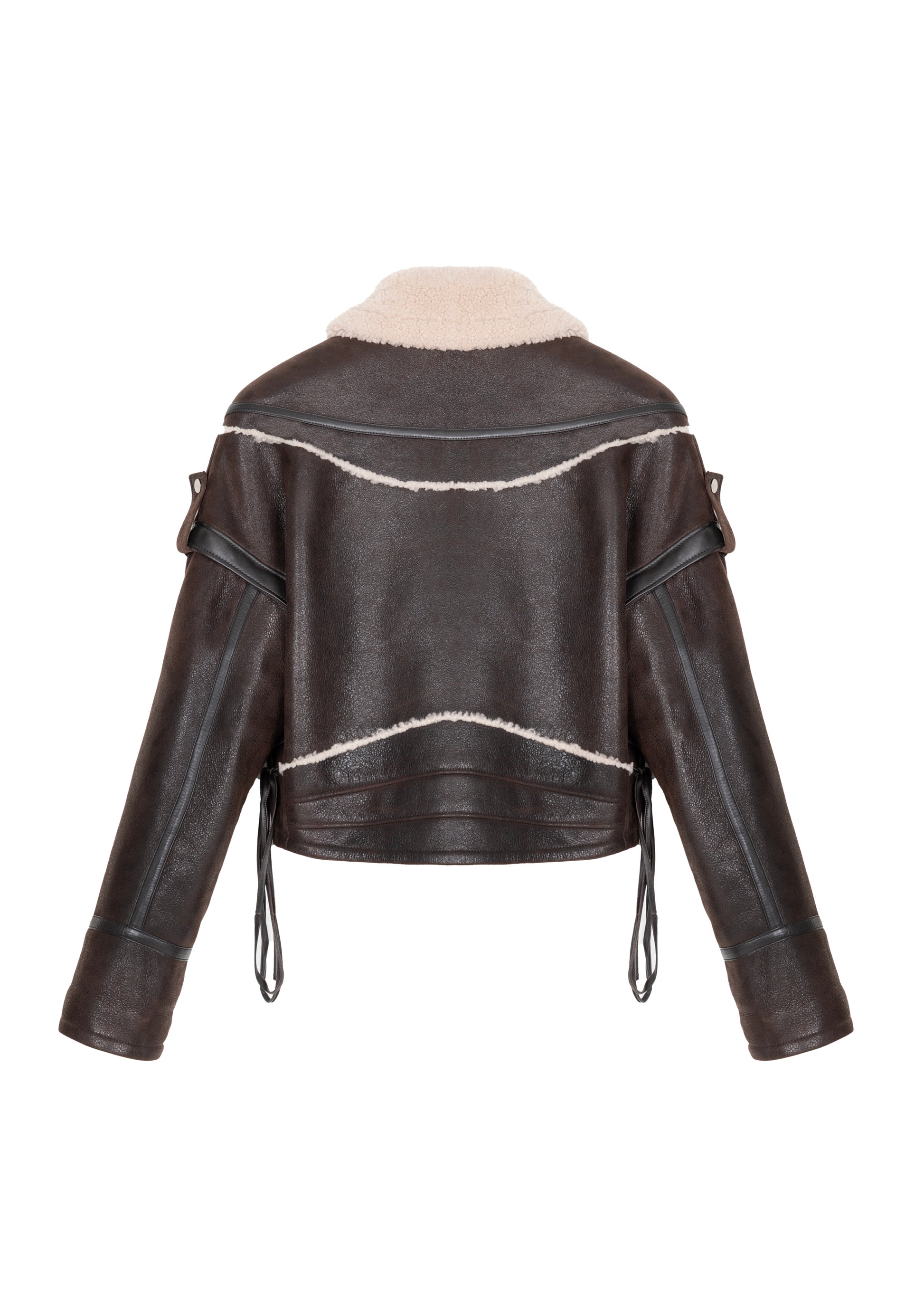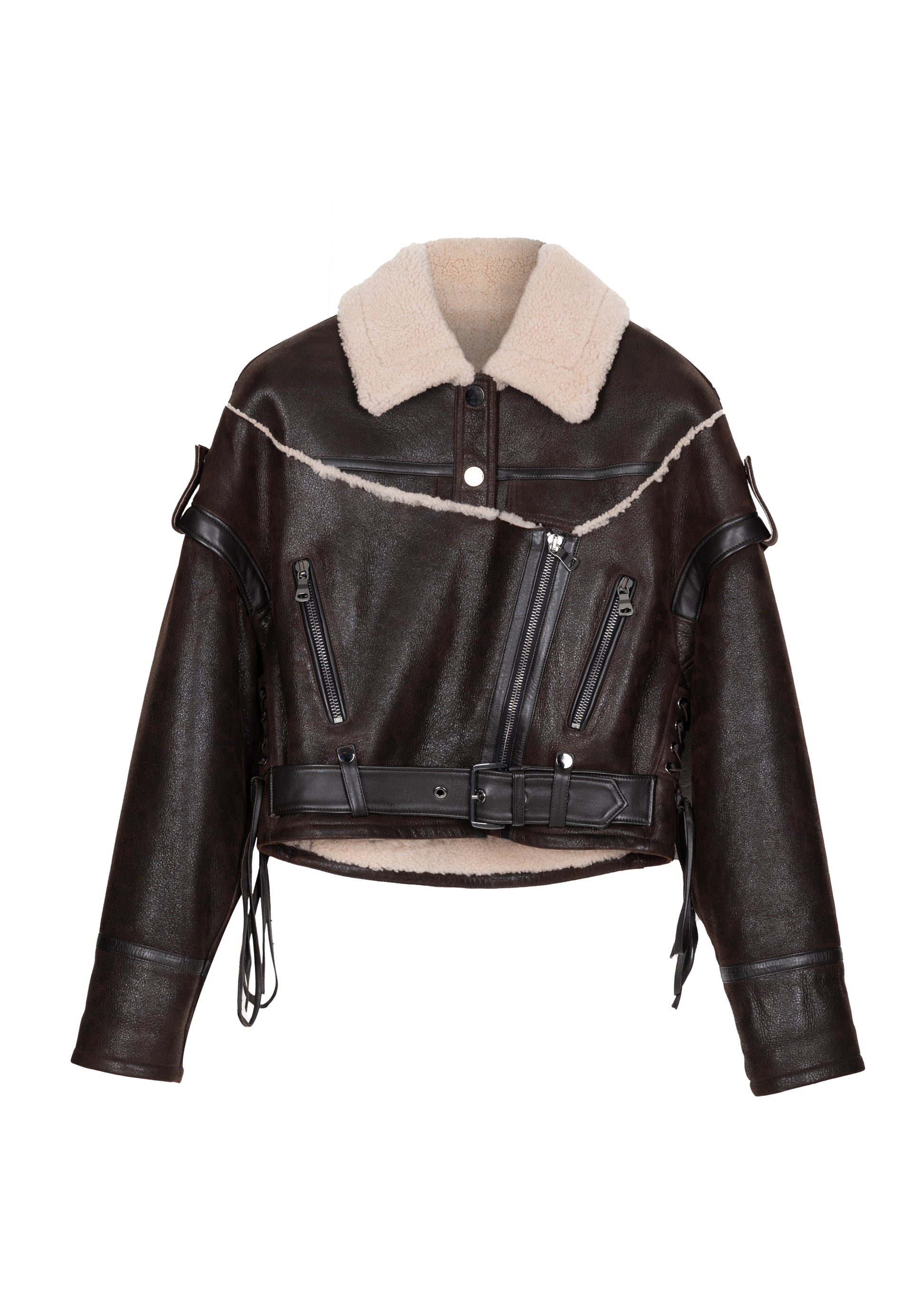 This DREJANI shearling leather jacket embodies a fusion of rugged style and luxury. Crafted from high-quality leather with a textured finish, the jacket features a distinctive shearling collar and lining for optimal warmth and comfort. The asymmetrical front zipper adds an edgy touch, while leather straps, buckles, and zip details on the sleeves enhance its biker-inspired aesthetic. The deep, rich brown color and vintage appearance give it a timeless appeal, making it perfect for cold-weather layering and chic urban style.