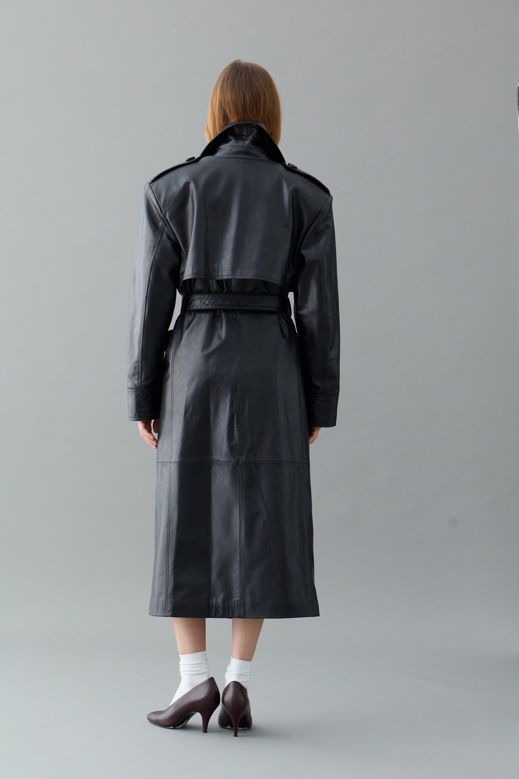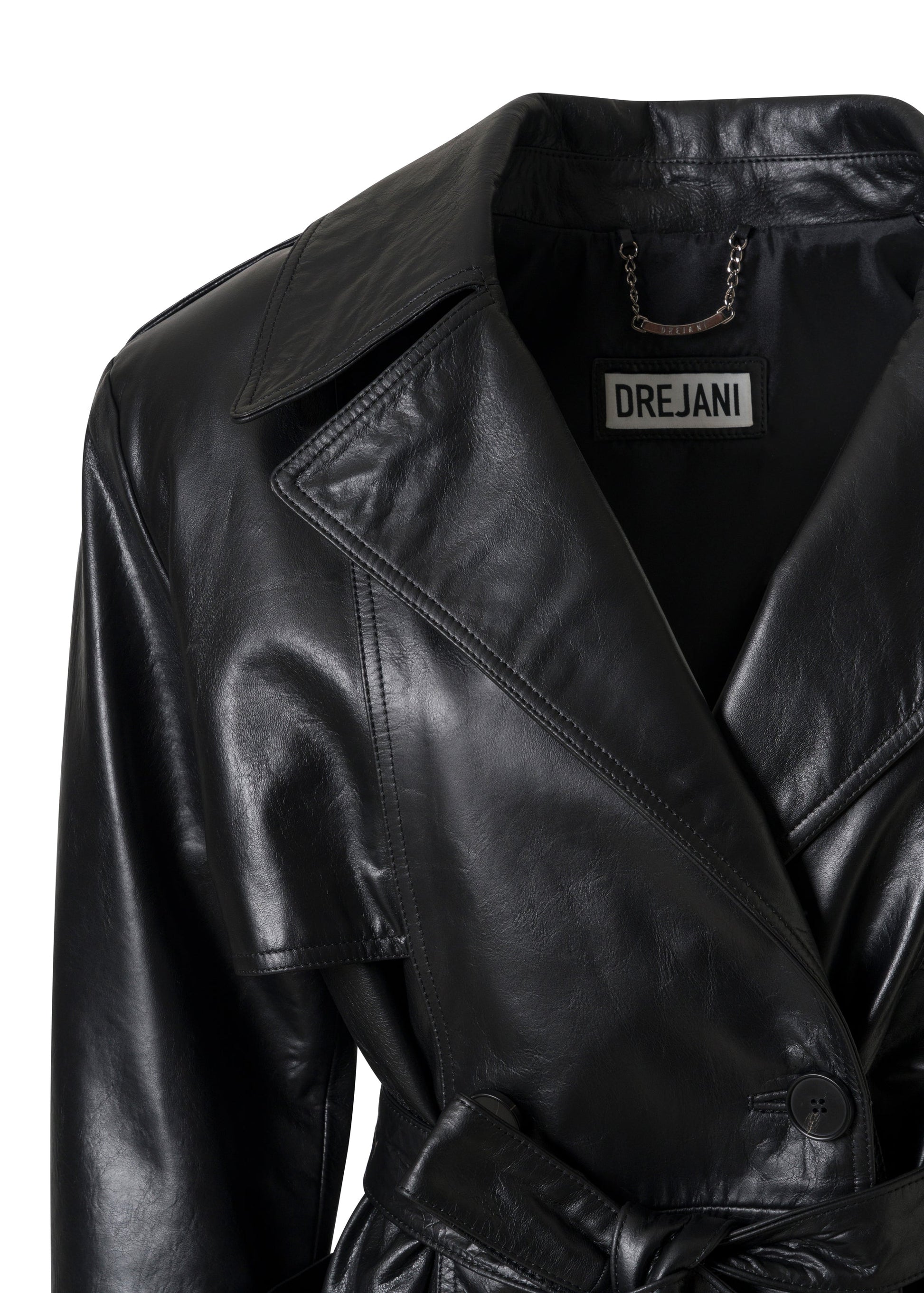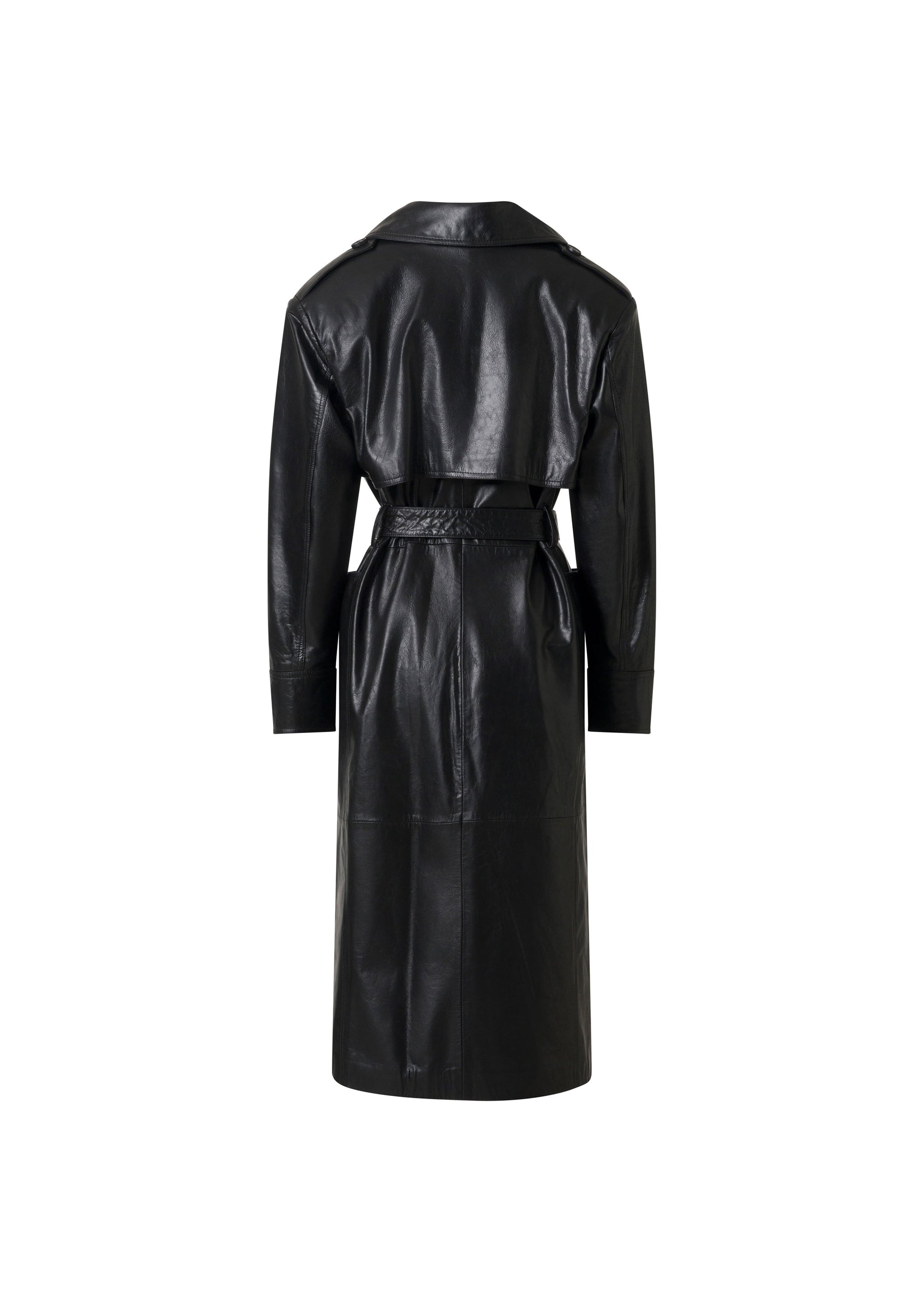 Double-breasted trench coat crafted from smooth, high-shine lamb leather.